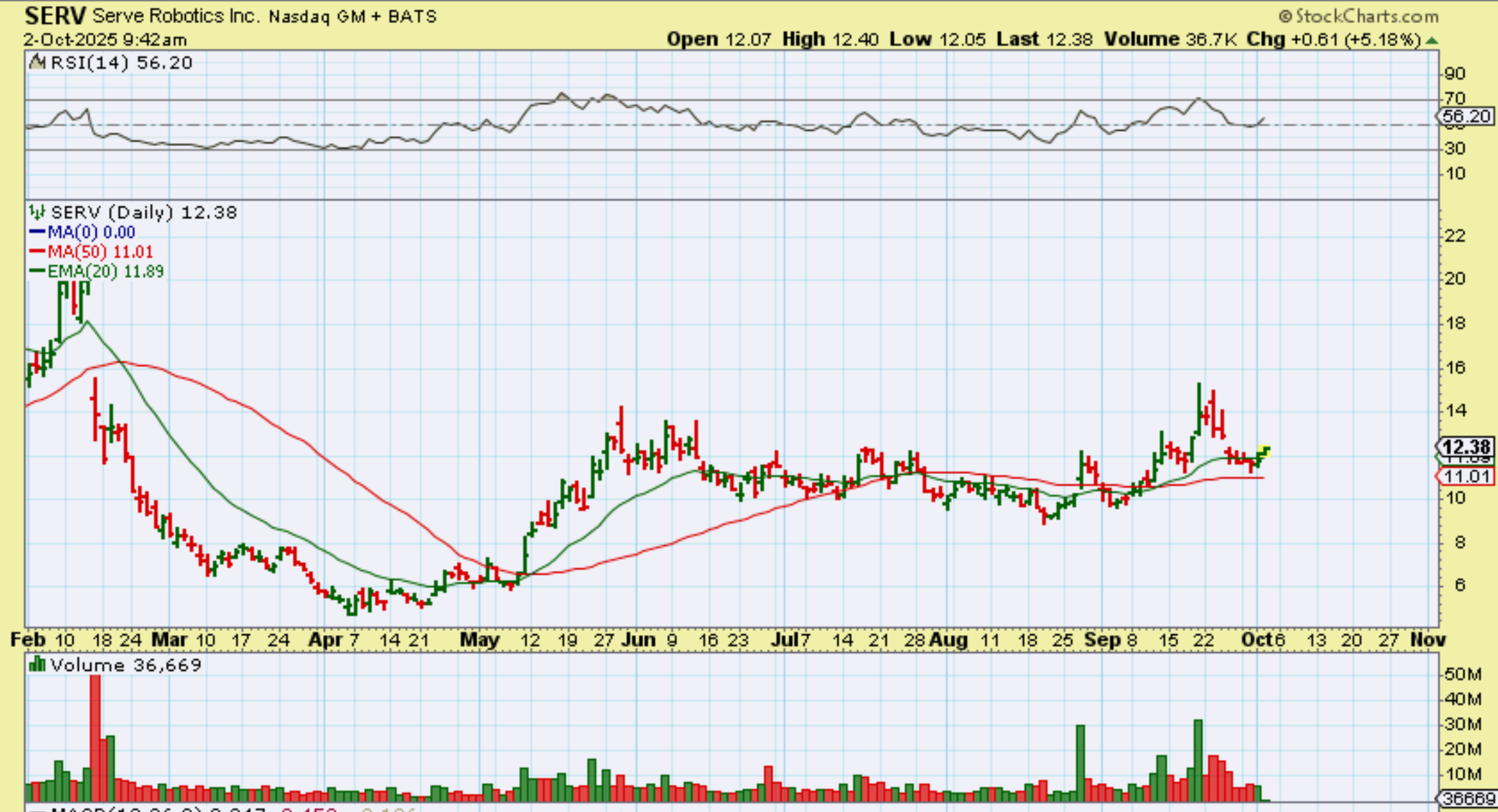 RR is a Robotics stock, and it has been running very well for us, so I also added SERV as it reverses at the 50sma. It closed up 7%, but it is still not overbought and can run further (much further really)..