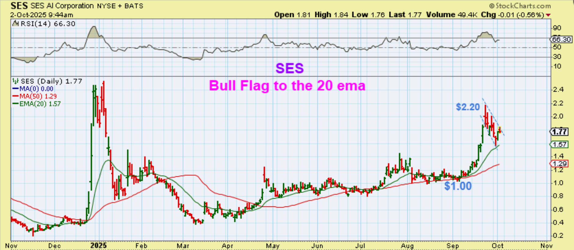SES is a bull flag in the AI sector and reversed at the 50 sma. The last run ran from $1 to $2.20 (over 100%) so this might break out and run swifty soon.