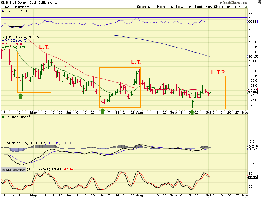 The USD will put in decent bounces, but it has then peaked as Left Translated and continued lower, so we are either putting in a rounding bottom now, or we will have more of the same.  So far, The USD is dancing around the 50sma, but it looks like it should be able to get above it for a while, like it did in July-August. That MIGHT dip Gold lower, but so far the USD strength has not affected Gold and Silver.