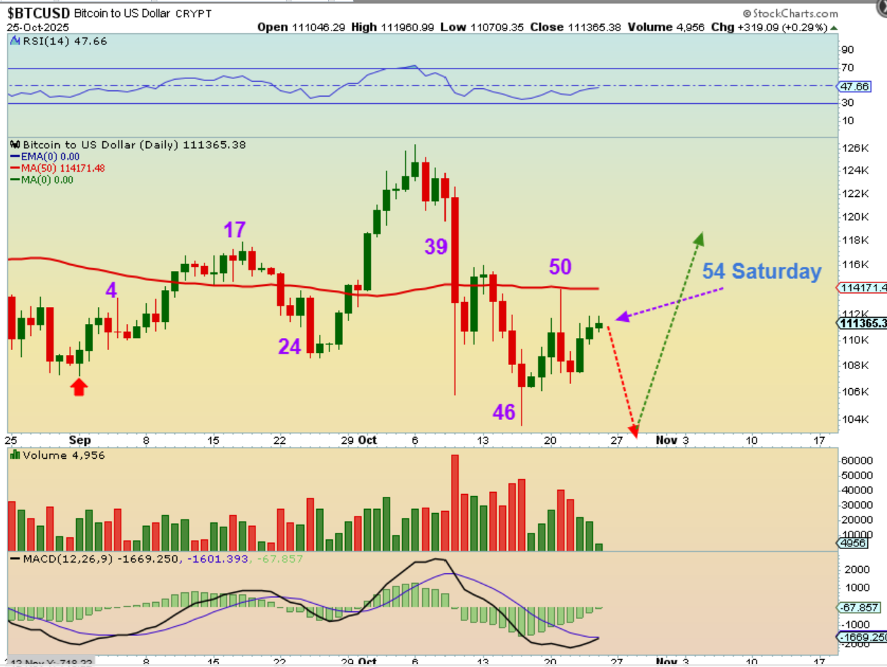 SILVER had a topping candle last week, on top of 9 straight weeks higher too. If you look at this chart, where would you find the deepest low in 2025 (The ICL)?. It is easy to see that the last ICL was in April, over 6 months ago. Our daily charts showed this as a 5th daily cycle, so Silver is due for a pull back and we had a 6% drop last week. Even if we get a ‘Pop’ with a fed rate cut, we may have seen the top already. An ICL is due.  Buy the rumor, sell the news.