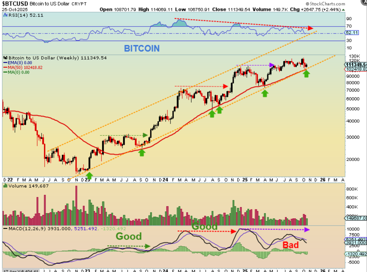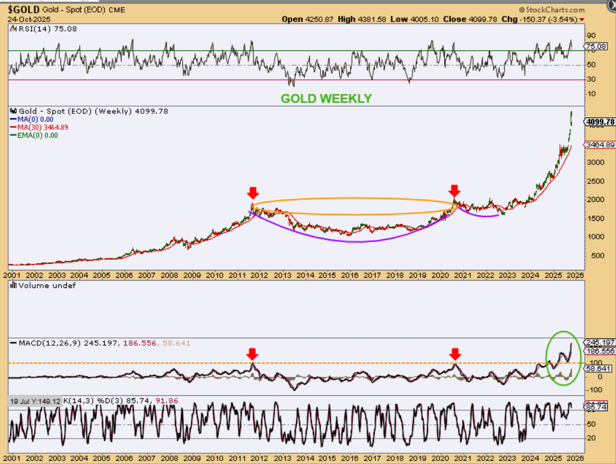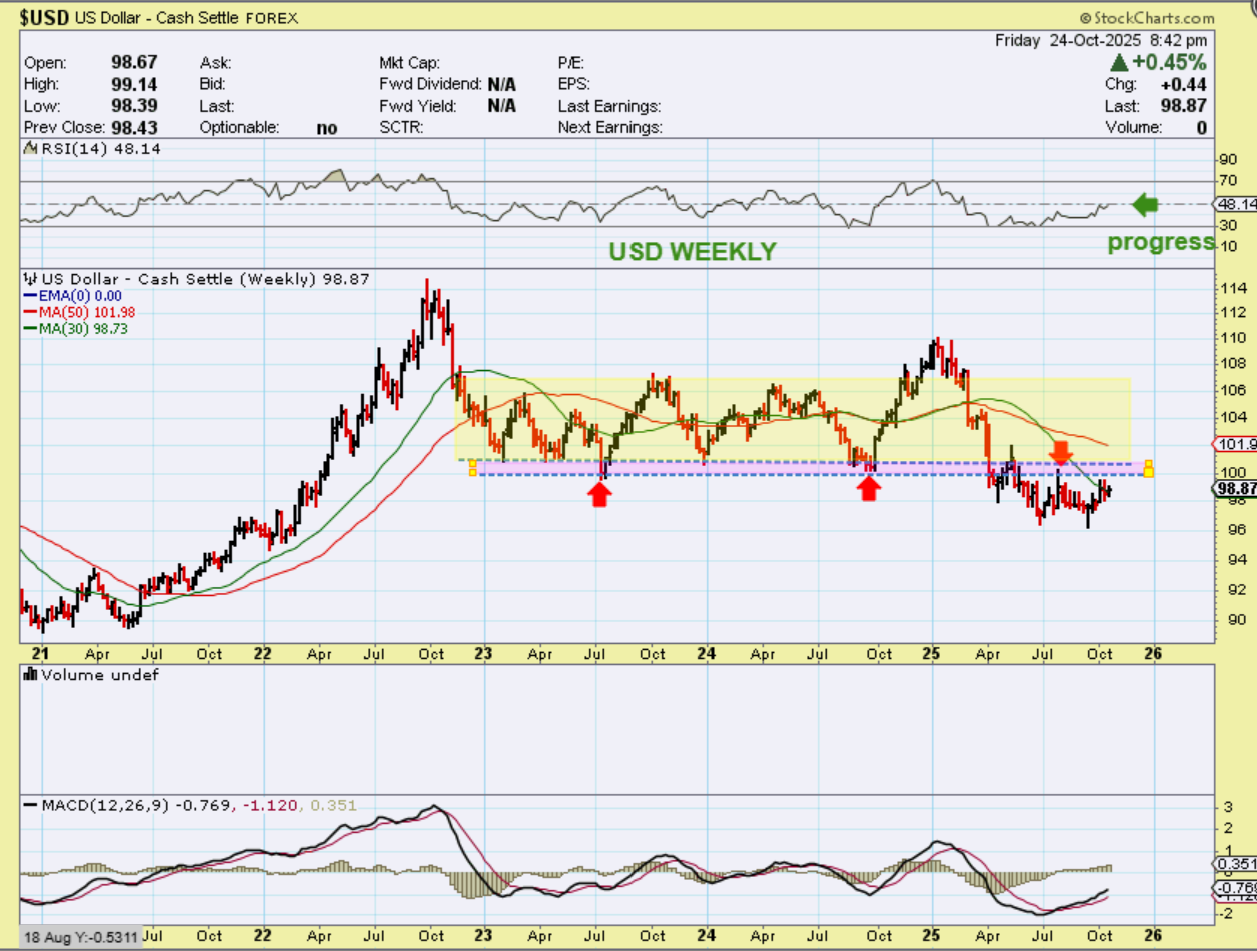 USD WEEKLY – I see improvement with the USD. It is starting to resemble a round bottom base, and the RSI has reached 50%. price also closed slightly above the 30 week ma, and that is a bullish sign on a weekly chart, so the USD may try to get back above the 2025 Breakdown.