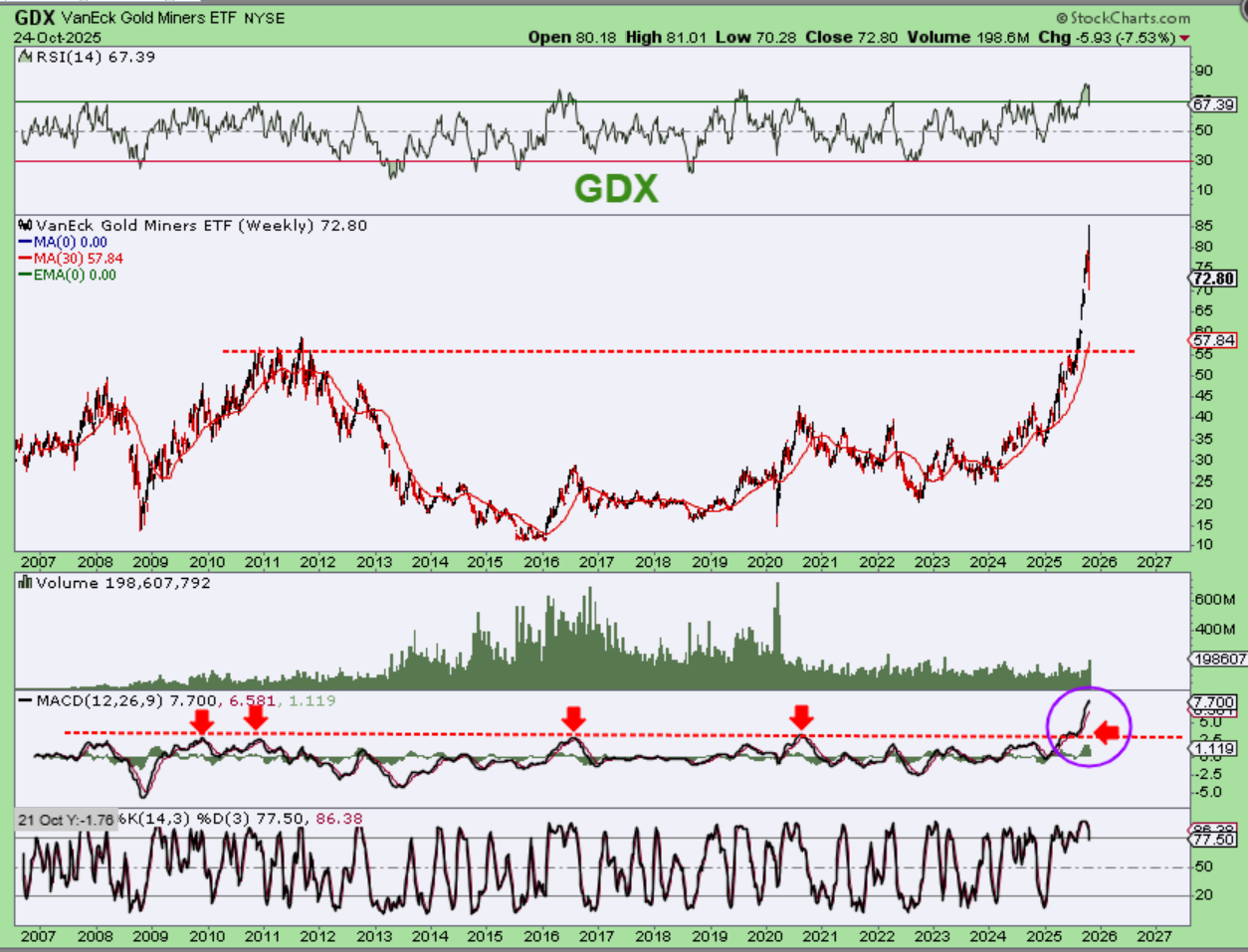GDX WEEKLY – Again, take a look at the MACD. That is EXTREME as price moves sharply higher. Prior peaks for the GDX chop lower, so it is possible that we do not see a higher high if we bounce from here. We are due for an ICL and this could just chop lower.