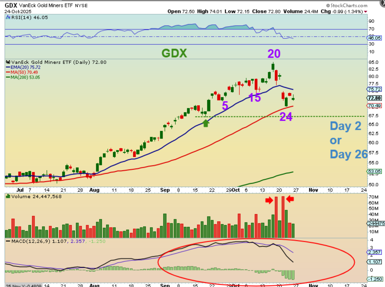 GDX – I did not like the MACD on GDX. The Miners dropped sharper than Gold & Silver. They often lead the way when smart money is buying or selling. We currently have a peak on day 20 and a low at day 24, but this also could drop one more time to give us a day 30ish dcl rather than day 24. Now take a look at that volume…