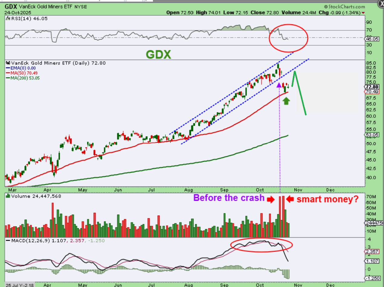 GDX – Even before breaking that trendline, Volume surged. GDX paused for a day and then gapped down below that trendline with massive volume again. This looks like a top.