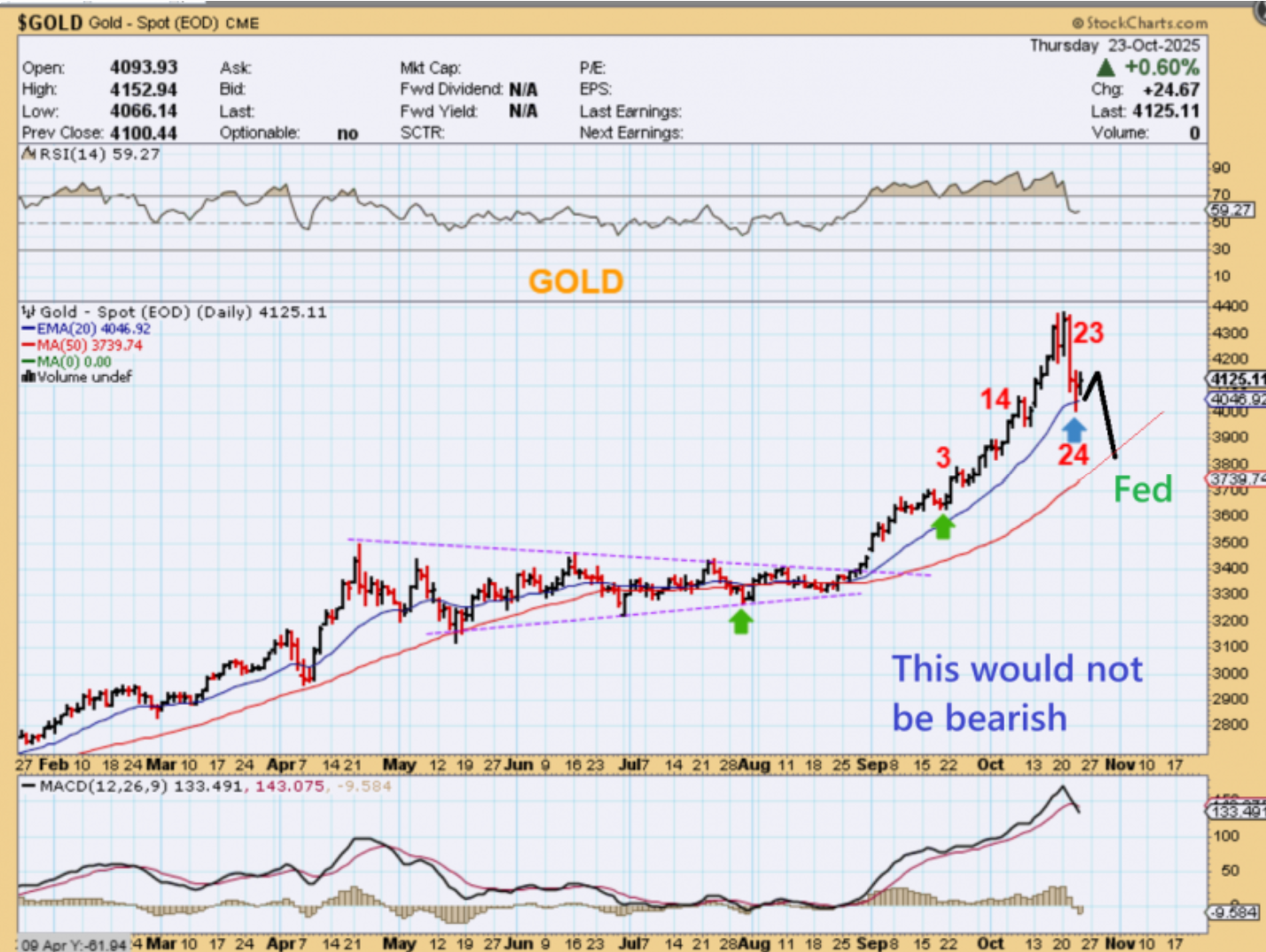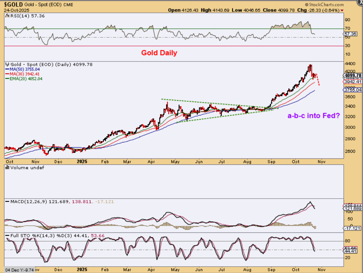 GOLD – This is a close up of a drop to the 50sma by Fed Wednesday. That would not make this bearish with day 28 or 29 as a low.