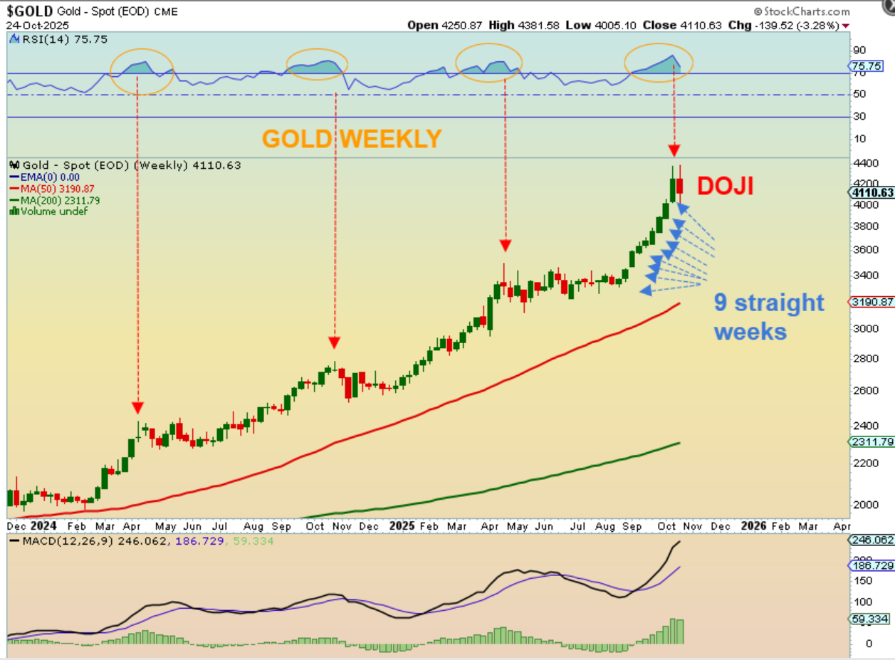 GOLD WEEKLY – A 9-week rally is why that looks straight up on a big picture chart, and a DOJI starts the selling. I think that it is very possible that Gold is topping or forming a peak here and will begin a drop into the ICL over time.
