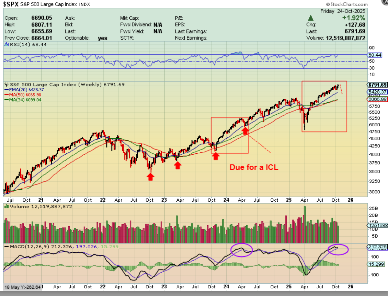 SPX WEEKLY – The weekly chart is where we see that we are due for an ICL. They come roughly every 6 months and seem to drop toward the blue line (20 week ema). See the Red boxes as a guide.