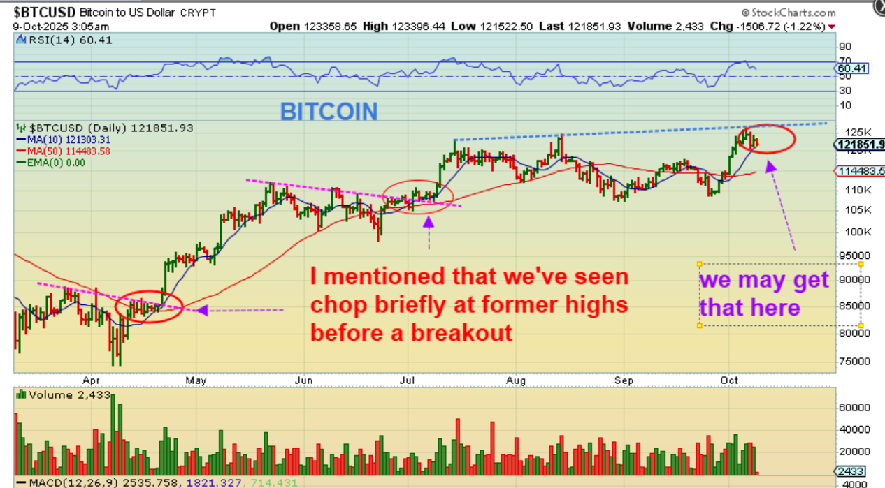 BITCOIN pulled back, surged higher and then pulled back again. We may see more chop before it can break out higher.  Read the chart.