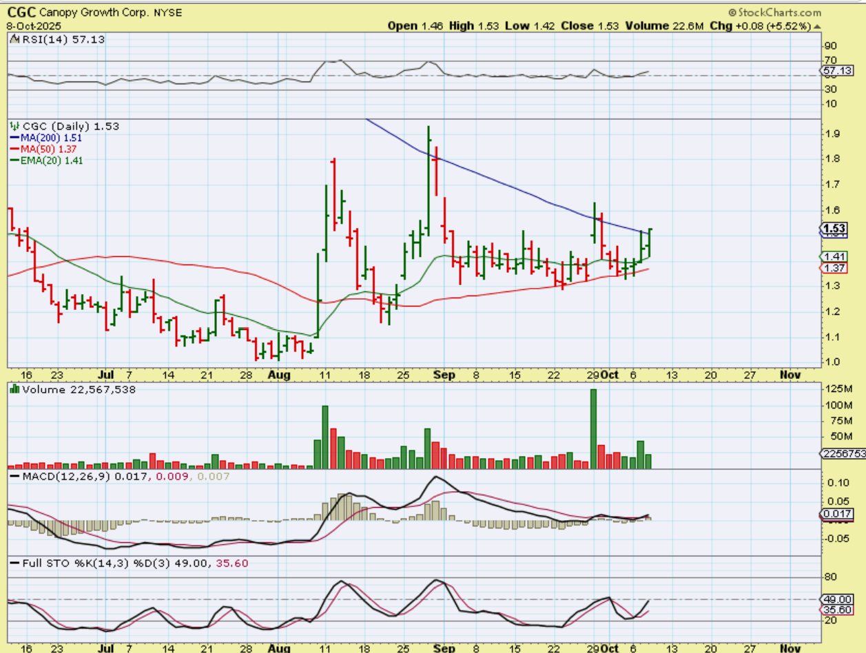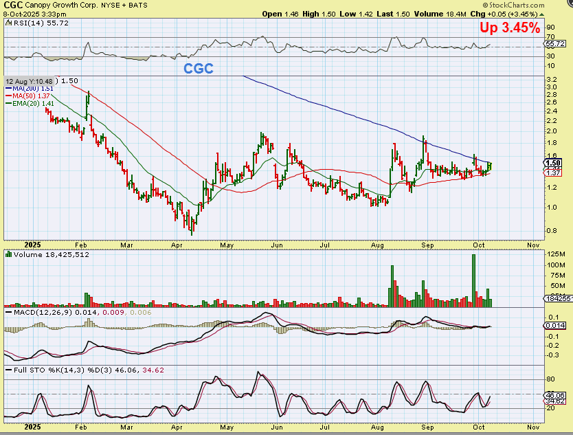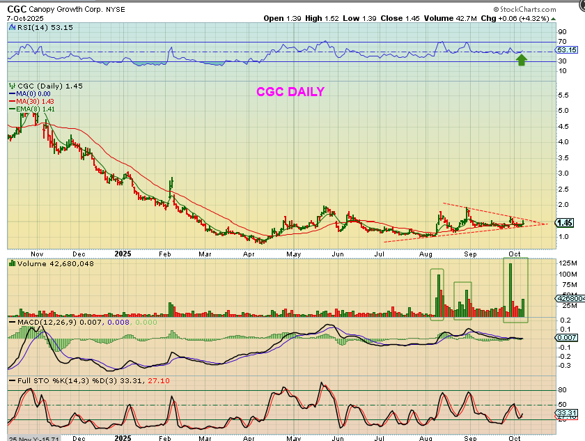 Take a look at CGC.  The markets were down but CGC was up 4% (pop and drop, it was up earlier in the day). This is a nice long base and a ‘triangle’ or ‘wedge’ has formed. TLRY, OGI, SNDL, etc already ran higher out of their bases (See  charts above), but this lagger may be a bullish set up – set to play catch up. The only problem would be the dreaded public offering.