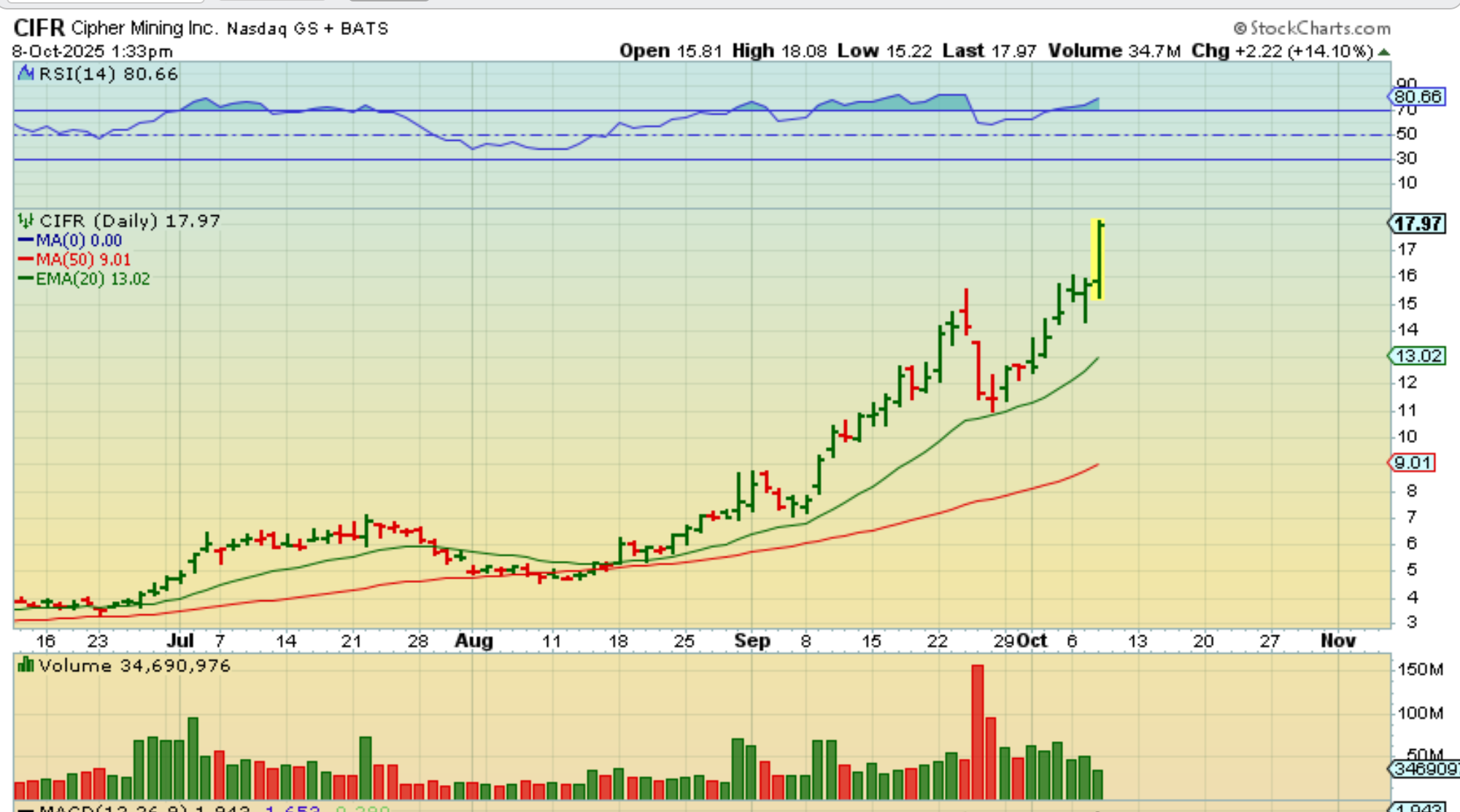 CIFR – I saw several crypto stocks take off at the end of the day, after being red, and ramp up quickly.  CIFR and BITF took off and were up 14% in minutes.