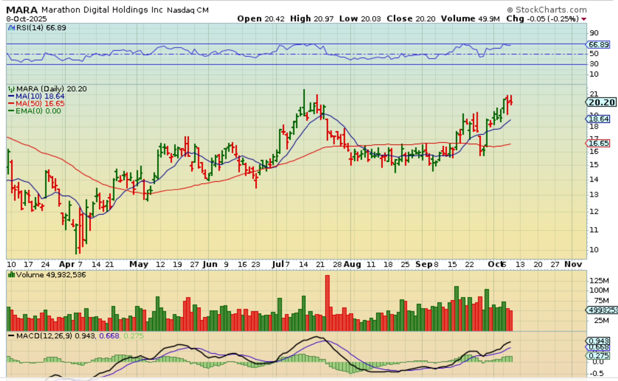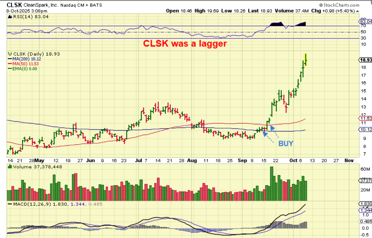 CLSK was under the 50 & 200sma in September, lagging Bitcoin and the other stocks like IREN, HUT, WULF, CIFR, etc. Well, CLSK ramped up and has almost doubled in a month! Congrats if you bought it and rode it higher!! MARA was also lagging too. Has it almost doubled?
