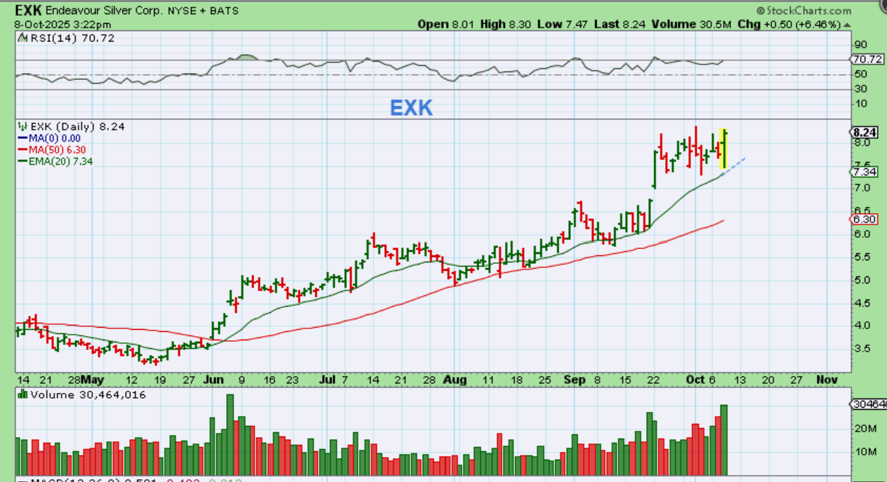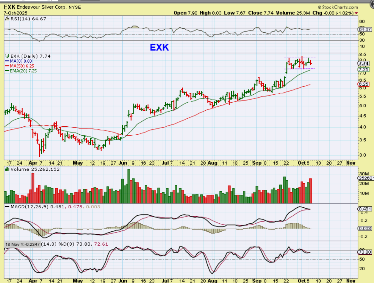 EXK: Why are some of the Silver stocks just chopping sideways? Sometimes that is what happens during a nice run. We get both buyers and sellers and a consolidation forms, which can break out higher and run too. This may tag that 20 ema and then make a run higher again.