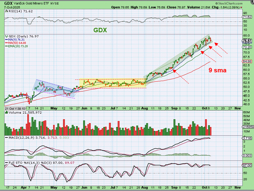 GDX was sloping lower in April – May, then it popped and started to consolidate sideways for months too. Those consolidations can then build up energy, and we are now in a vertical ascent. This is a very strong bull that isn’t breaking below the 9 sma yet. It will when it puts in a dcl, but this should only be day 14 today.