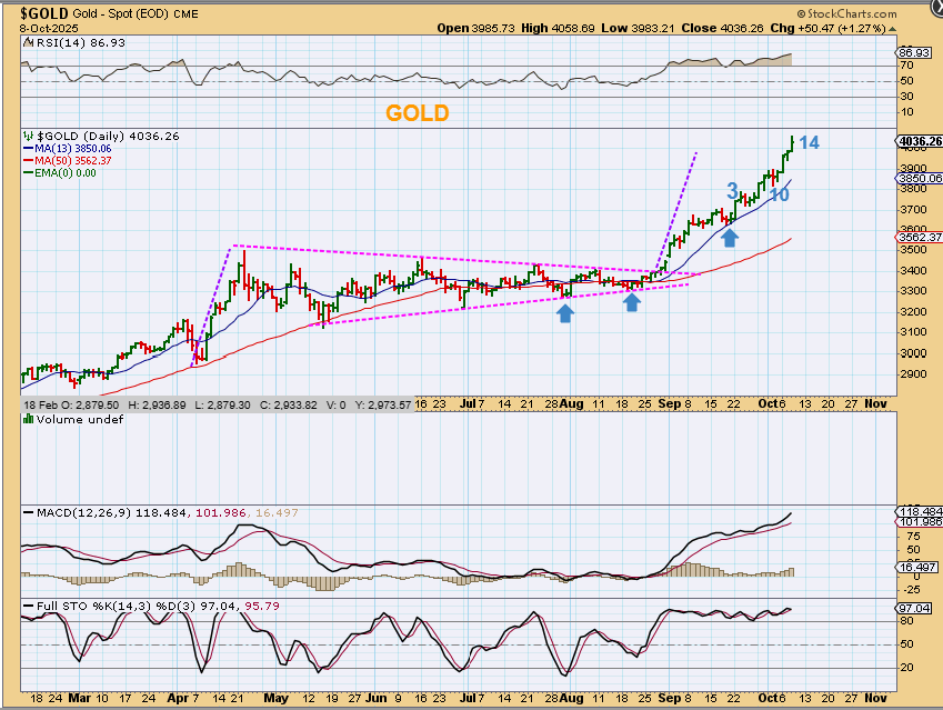 GOLD is running strong, and if it just keeps running higher, it would most likely be parabolic going straight up.  If it pulls back and gives us a daily cycle lower, however, then it can reset and make another very strong run. I’m hoping for that ICL dip, because then you could load up and ride that Rocketship higher.