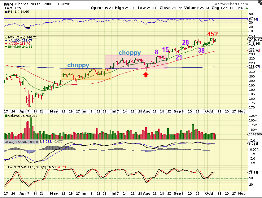 IWM was choppy after a short run out of the ICL. Then it pushed a little higher in June, and then became choppy again. Right now, the IWN is chopping steadily higher along the 20ema. If this has a day 45 peak and this is day 47, we should top soon, but the dip could be mild again.