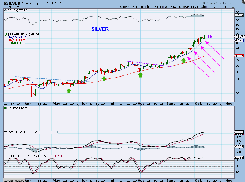 SILVER is very similar now. It was choppy and bumpy for a long time, but we are seeing more steady buying as it stretches upward. At day 15 it can climb to day 20 or even day 25 and then start to dip, so we just ride it out for now. It has NOT broken the 10sma, so that is a clue to watch for.