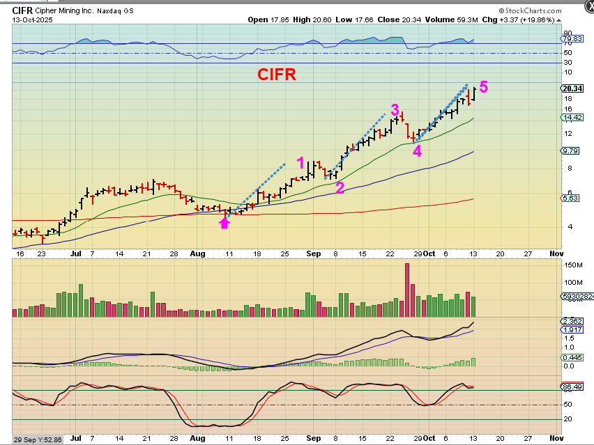 CIFR was actually up about 20% yesterday and is one of the leaders in this sector. It has continued to run higher despite Bitcoins choppiness and being back at the lows. We bought several of these leaders at the recent lows and either did a ‘buy & hold’ or traded them on the way higher, so I have covered them in most of the reports. A few of those leaders were CIFR, IREN, WULF, HUT, HIVE, BITF, BTDR, and BKKT. These ran without Bitcoin moving straight up. Then RIOT, CLSK, CAN, BTBT, and others started to play catch up, so keep your eyes on these.