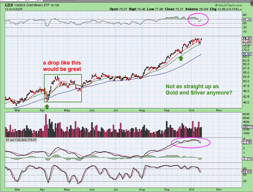 GDX has chopped sideways for the last week or 2. The RSI dropped and price is now back at the highs without MACD confirmation, so the Miners may be starting to get ready to pullback.