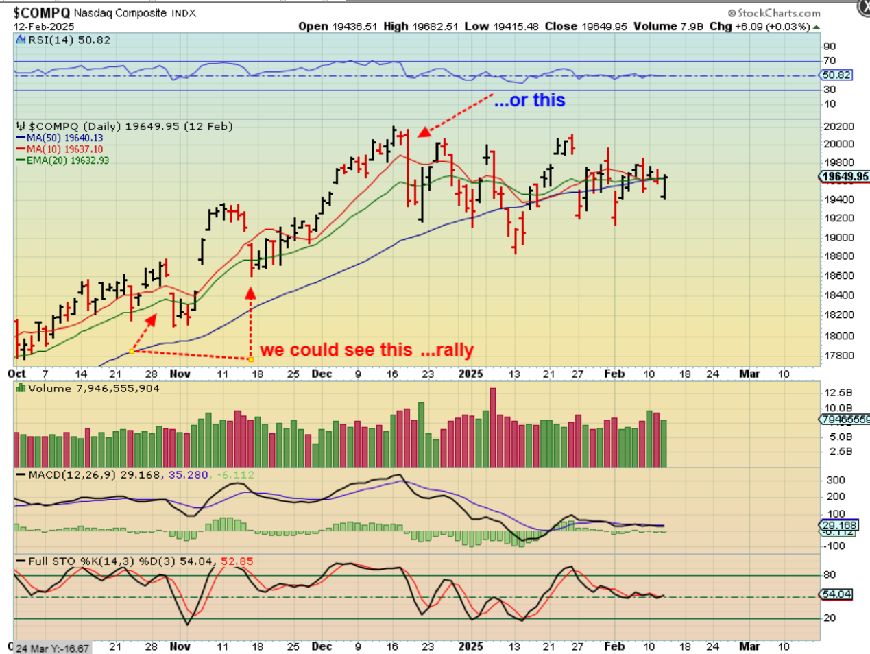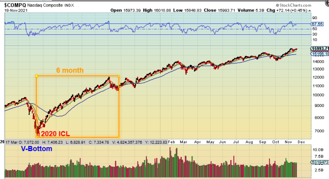 NASDAQ – So at 6 months, the very strong bull market of 2020 (Covid) surged upward, peaked, and dropped in a choppy a-b-c down ICL. After that, it was a return to the bull run.