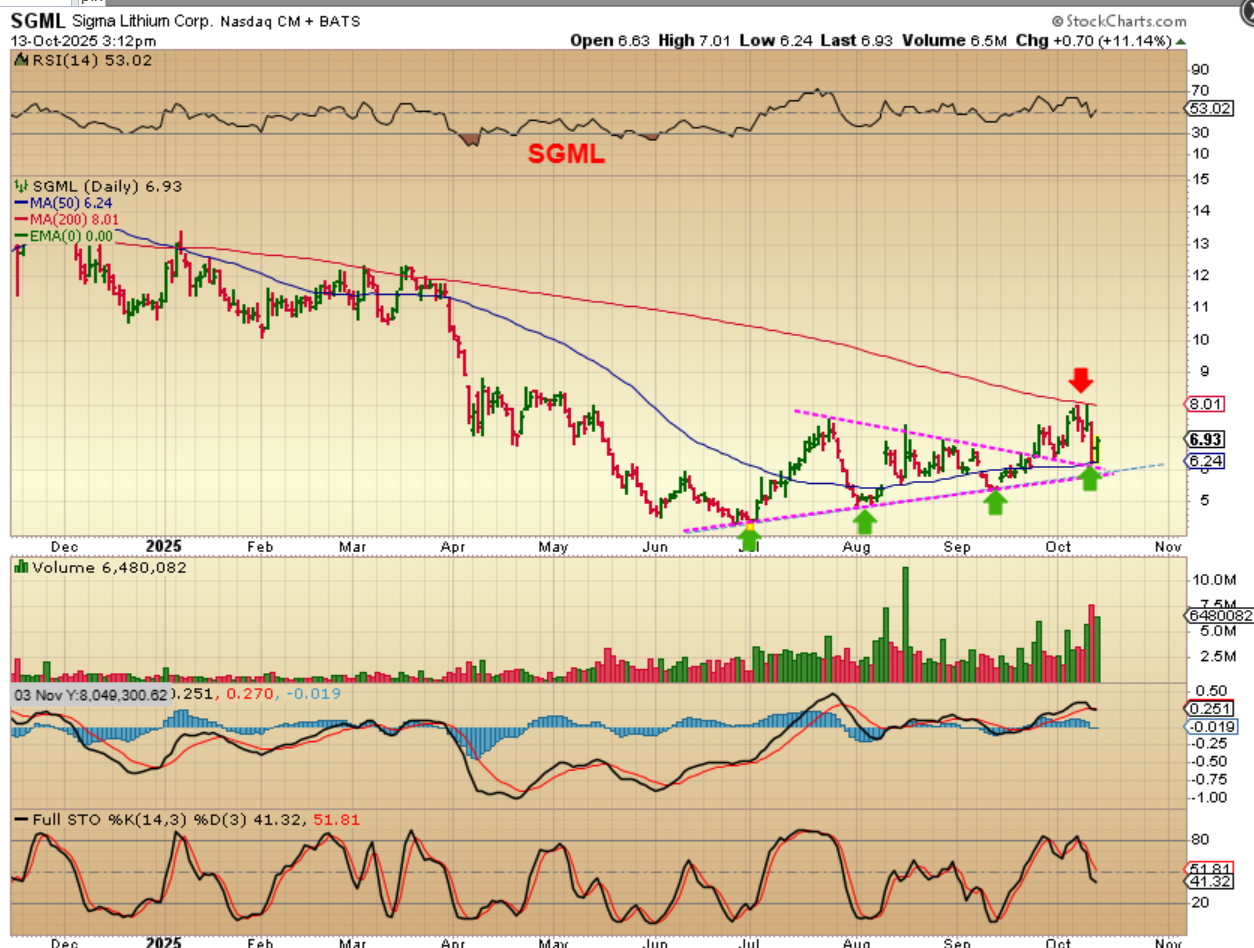 SGML might be worth buying. It reversed right at the 50sma and that is a back test of the triangle too. It was rejected at the 200sma last week, but may be ready to run. And…