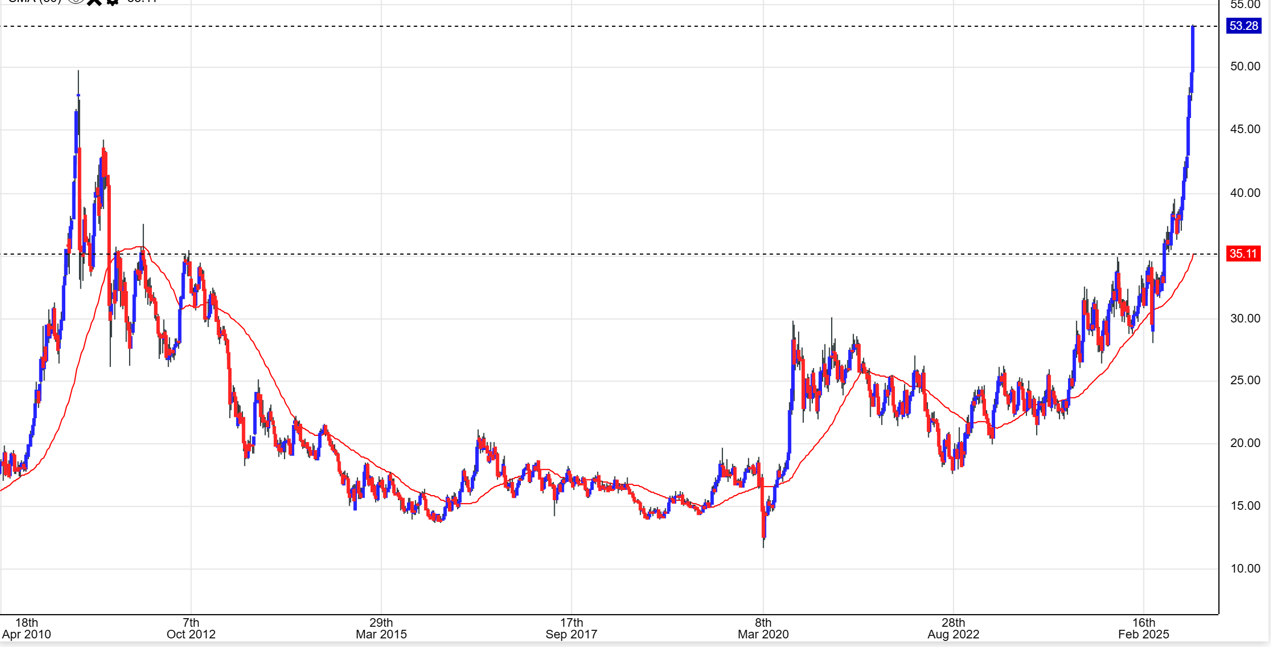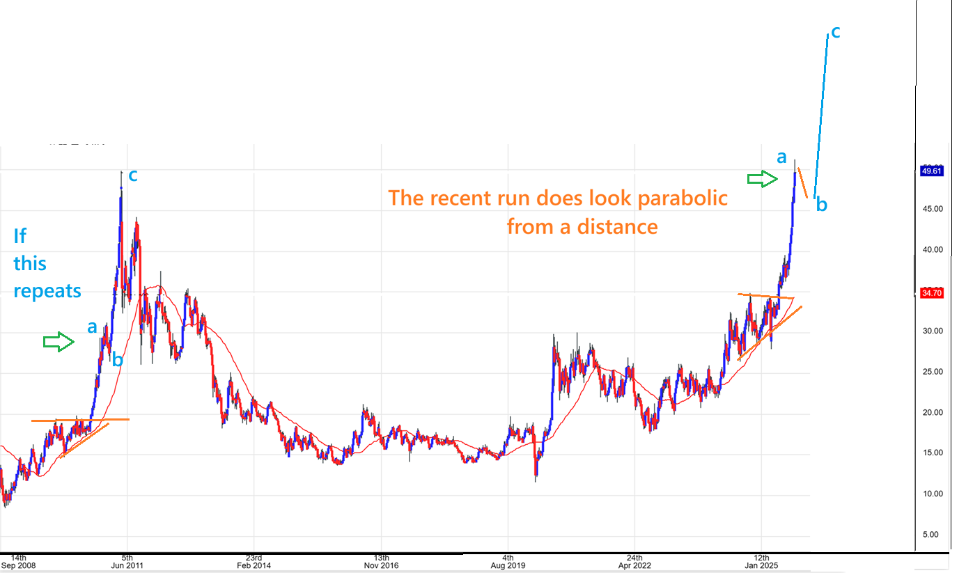 I took that last parabolic run up in 2010 and added the extension after the pullback to our current price. I know that an a-b-c is usually a drop, so I should have drawn this as a A-B = C-D, but you get the point. I’m trying to show a valid possibility where this parabolic looking move to $50 could extend one more time. In the chart ABOVE, that move to $50 does look parabolic, but view below, we saw a longer looking 2 wave move in 2010.