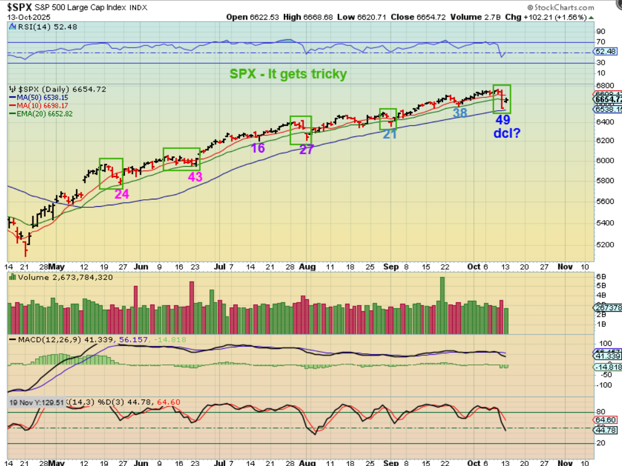 SPX -Let me remind you of the difficulty that has developed with our current Bull Market set up: All of the dips were basically mild 2 or 3 day dips. THAT is mild. We identify DCLs when they bend the 10sma downward, but we really haven’t seen that, so dcl’s are hard to identify…