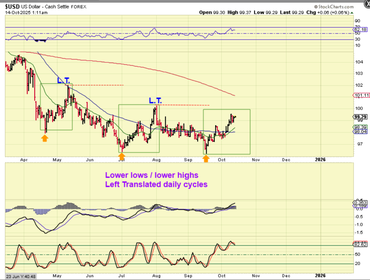 USD– I’ve been pointing out the last 2 daily cycles as strong looking at first, but then they’ve peaked early and become L.T. with lower highs and lower lows. I’m watching to see if we get a higher high this time…or not.