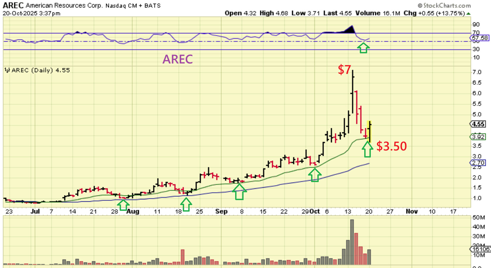 If AREC dropped from $7 to $3.50 in 3 days, THAT is Big. If it stops and reverses at support, and then runs from $3.50 back to prior highs ($7), that is a double. Well, it reversed and put on 13% when I captured this chart, but if it runs to $8 or $10 from here, it is still a double or more.