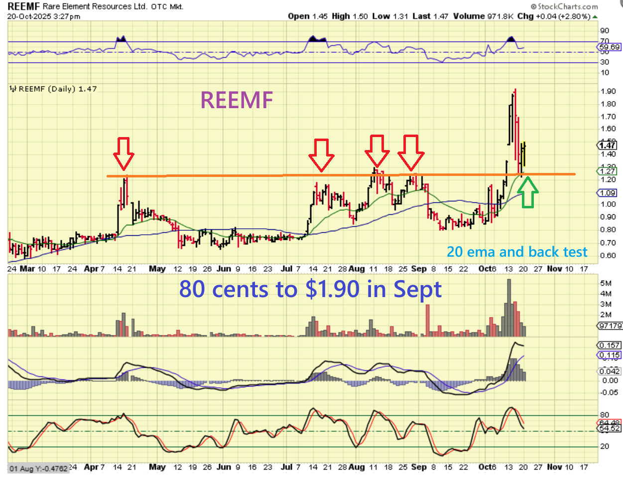 REEMF broke out last week and slammed back down too. It is ‘lingering’ at the 20ema and support area. This can be bought with a reasonable stop too.