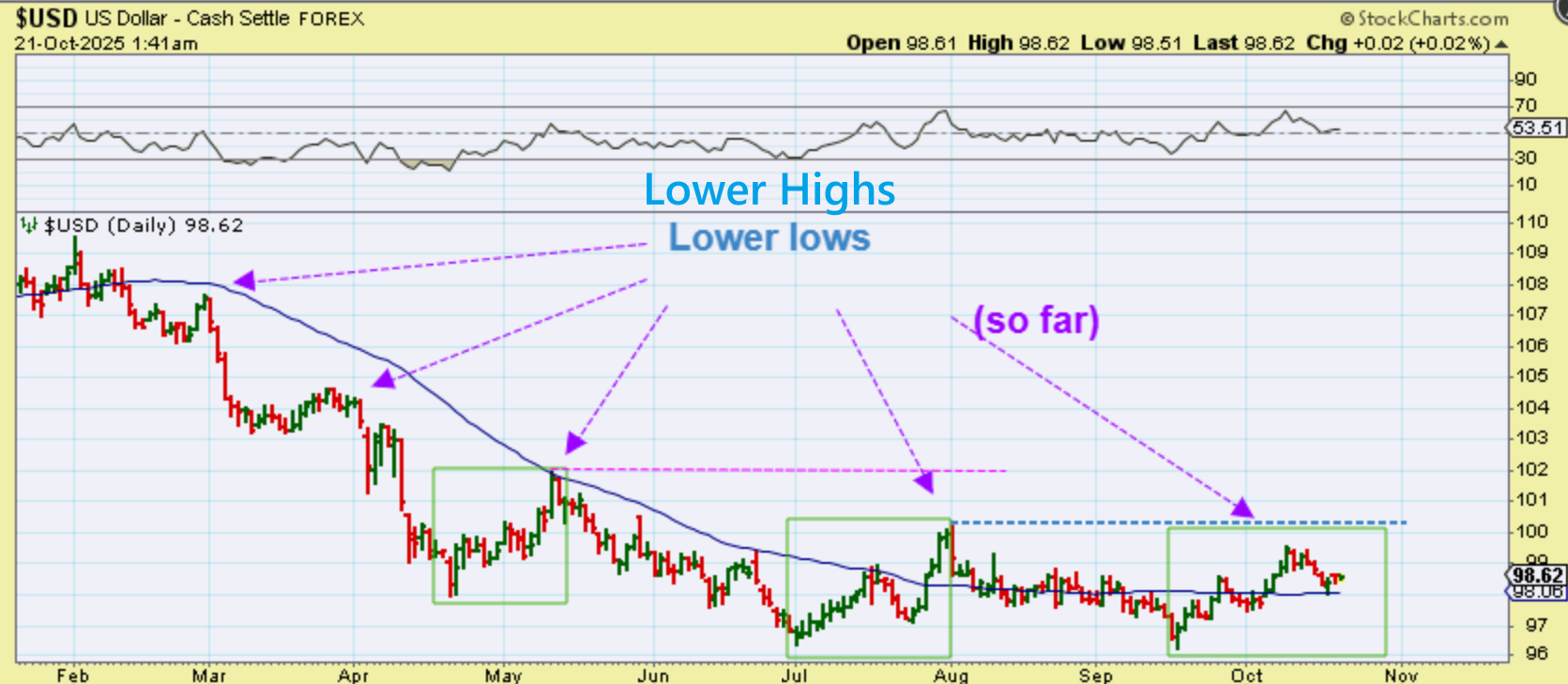 The USD was up 2 cents on Monday, and I have explained what I am looking for here. A new higher high—or not.