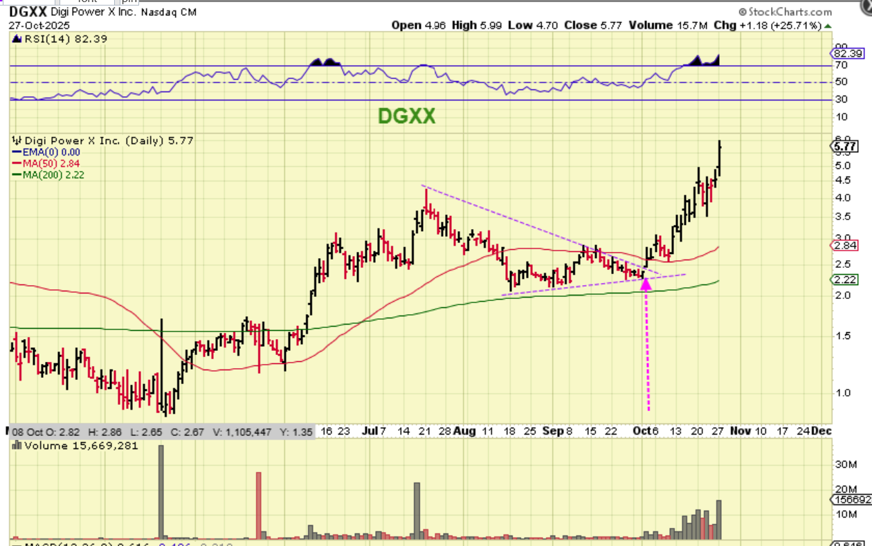 DGXX has also been running quickly to new highs too, but I have been feeling that it has something to do with the new report that came out on October 1st about the AI Certification. After that report, it broke the downtrend and hasn’t looked back yet. This strength could be attributed to its’ Crypto and AI.
