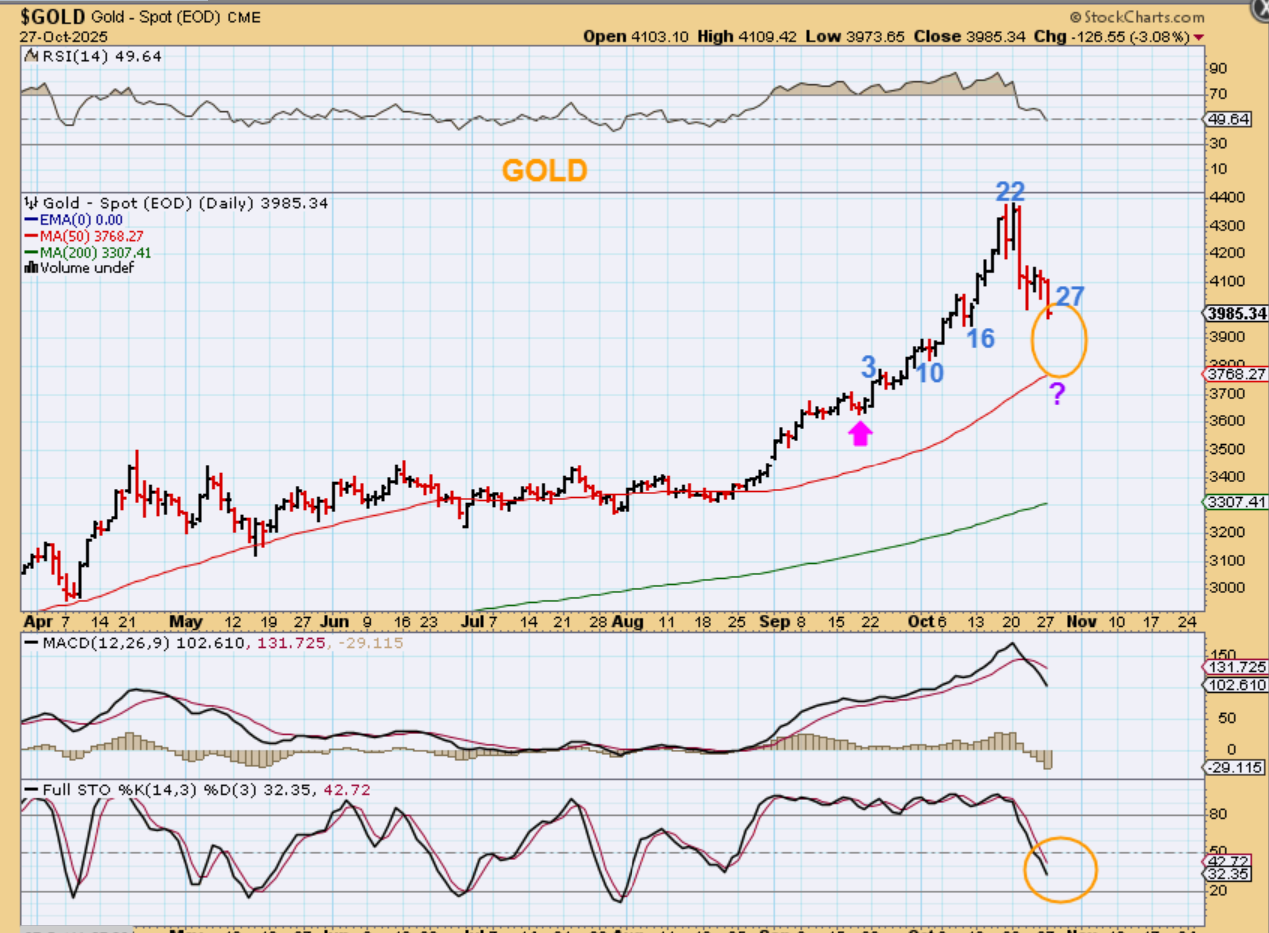 SILVER – Do you see Sept 17th here? Silver dropped as though it didn’t like the rate cut too, but then on Thursday it dropped and started to reverse into the end of the day. Silver started a rally out of that dcl. It also peaked on day 22. Will Silver tag the 50sma on this drop?
