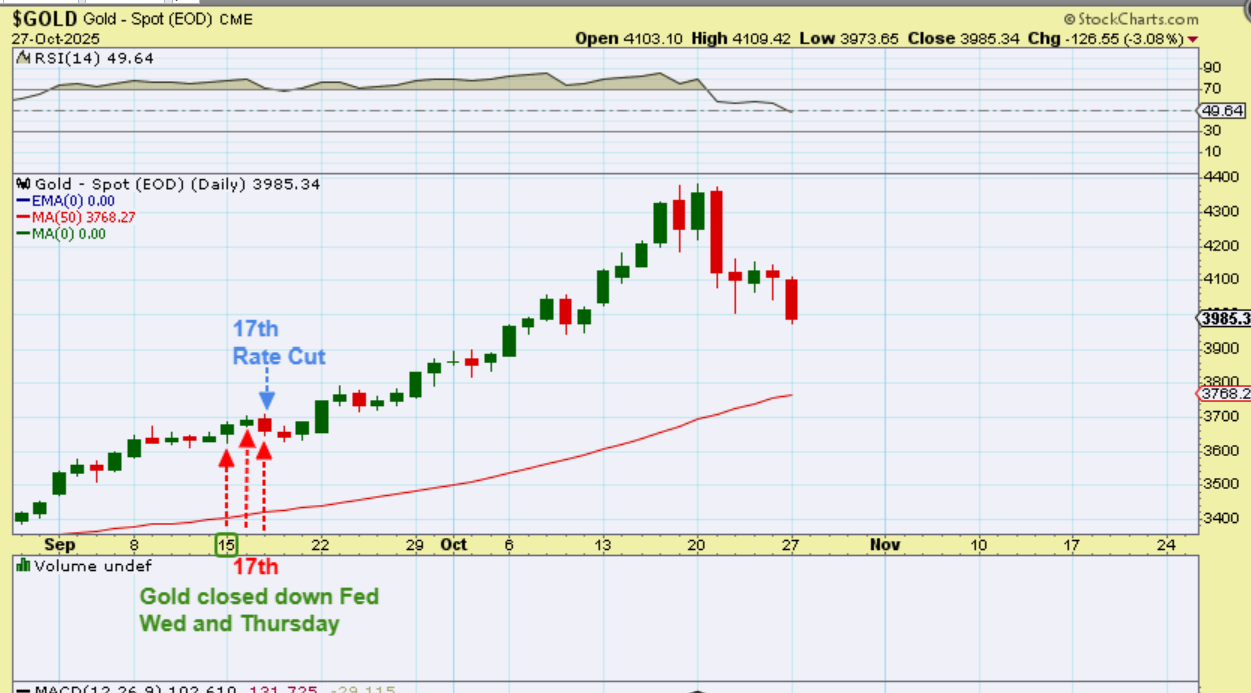 Do you remember what Gold did on September 17th, with the last rate cut? It closed red and was also red on Thursday, and that became an extremely mild dcl. It showed up more clearly with Silver & GDX. It then rallied up to day 22 after that, so…