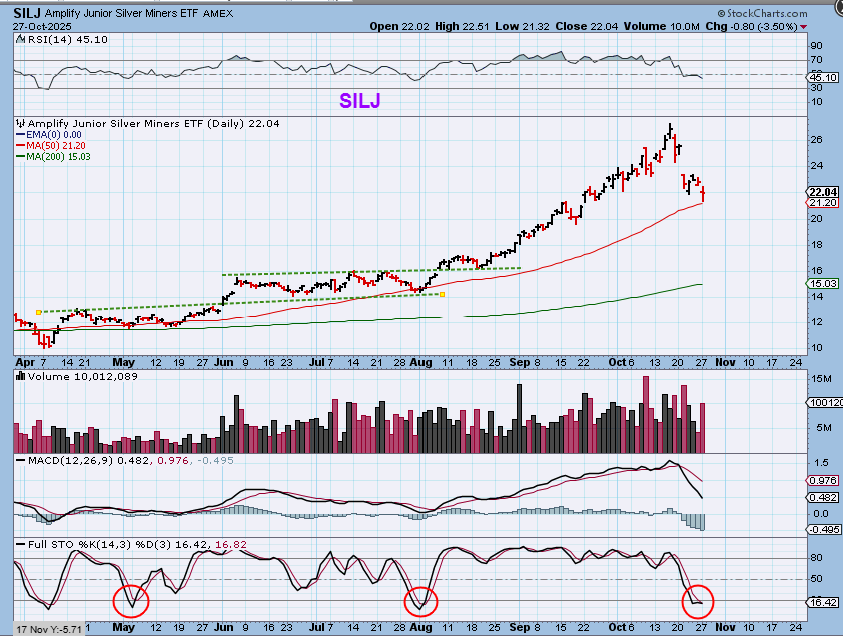 SILJ bounced at the 50sma. Yes, this is as of now and it COULD break down further, but it is worth noting because while EGO, KGC, HMY, AU, AEM, etc are now under the 50sma…