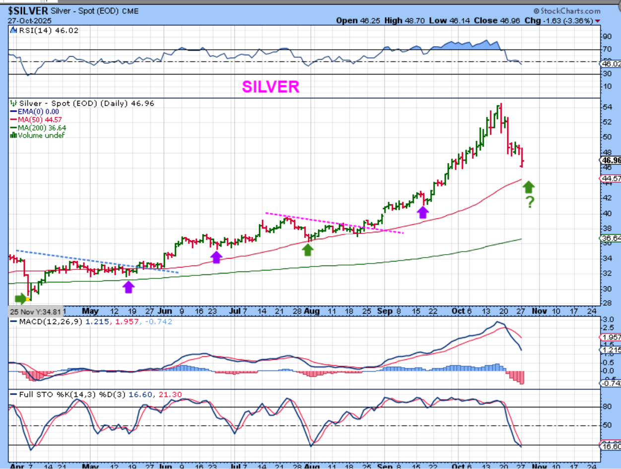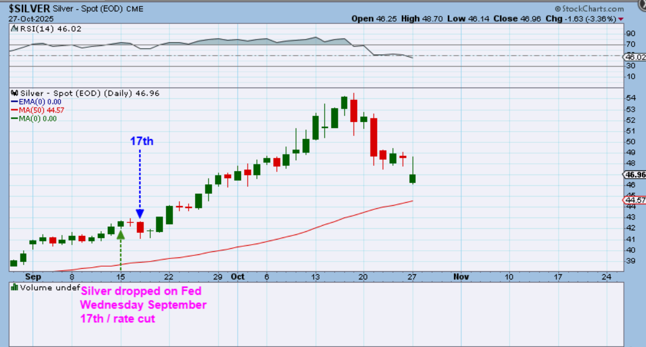 SILVER could drop to the 50sma, if it does what it did on September 17th with that rate cut, but to be honest, we cannot know for sure. We are coming due for a dcl though.
