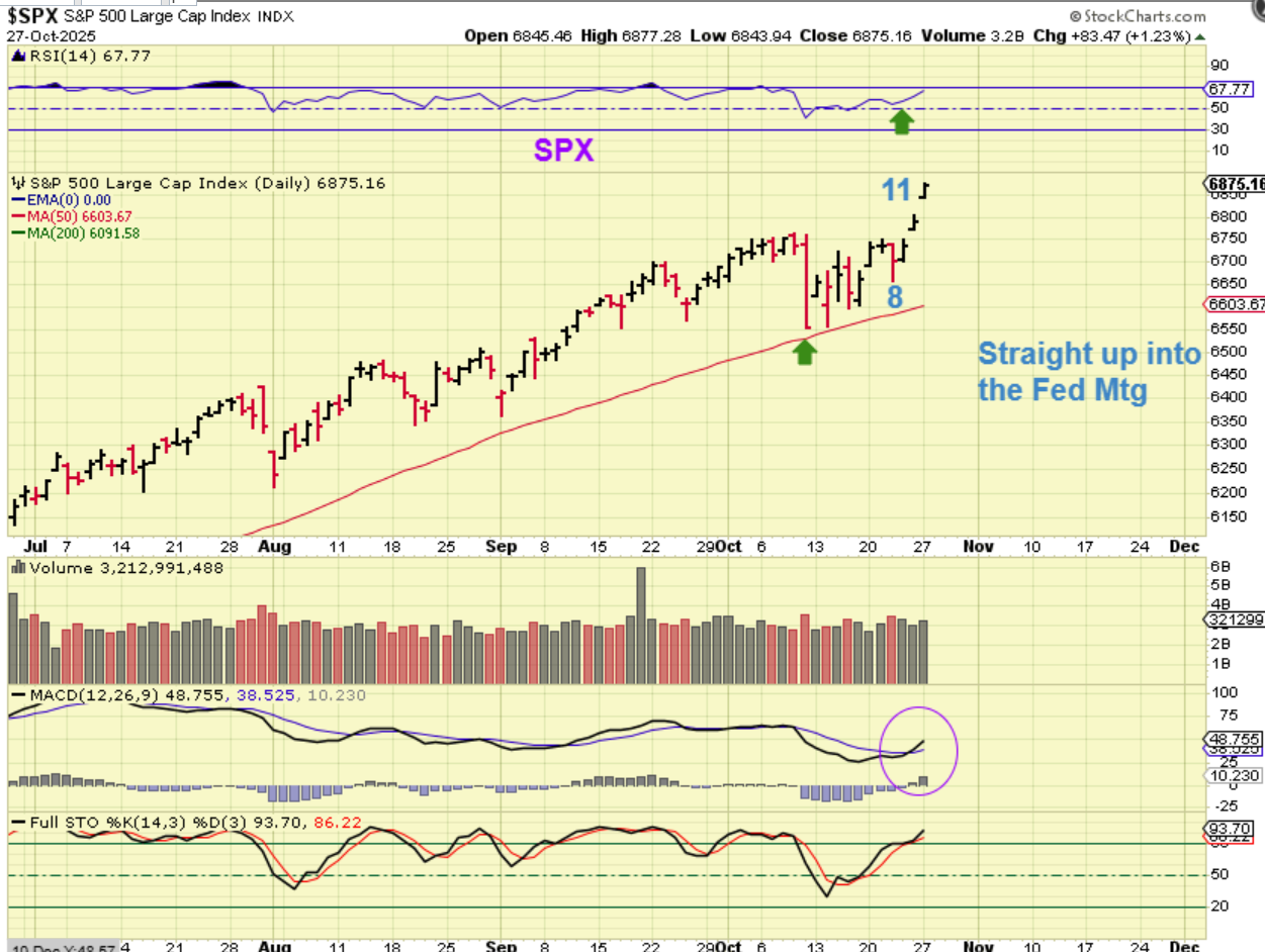 On day 11 The SPX has gapped up twice and looks very bullish, but it is still due for an ICL as we head into month 7, so we’ll keep that in mind. If the Fed doesn’t cut rates, I think we crash down, but even if we get that cut, it could start to fill these gaps and just keep dropping.  It is not an easy call to know for sure, because certain stocks and the precious metals sector have made parabolic type runs higher. It is possible that the general markets do that into the end of the year.
