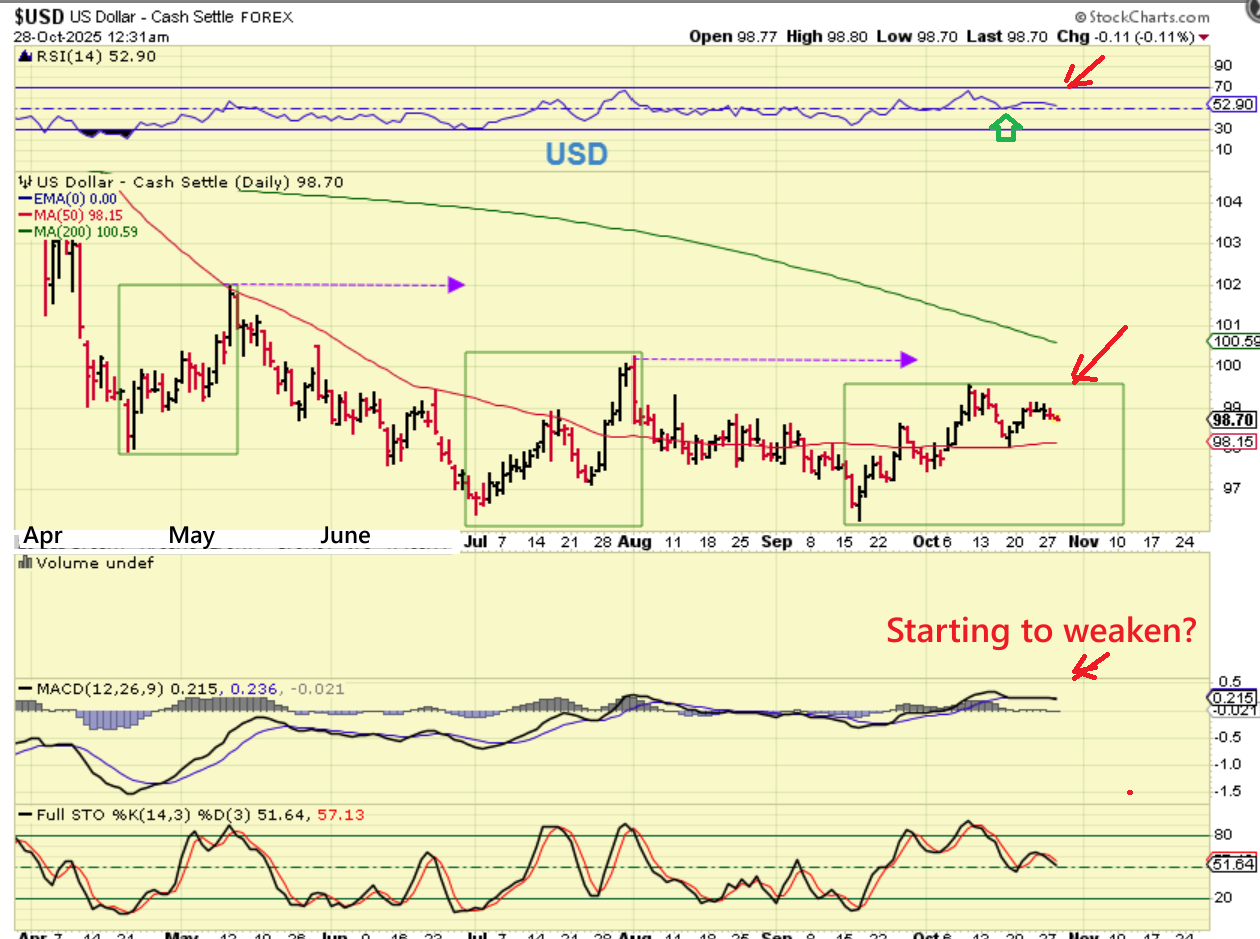The USD ran up nicely out of that low, but it is starting to stall out. It still resembles the last 2 daily cycles that rolled over as L.T. lower highs and At This Point, it looks to be weakening, but a rate cut COULD change that, since the last rally came out of a rate cut on Sept. 17th.