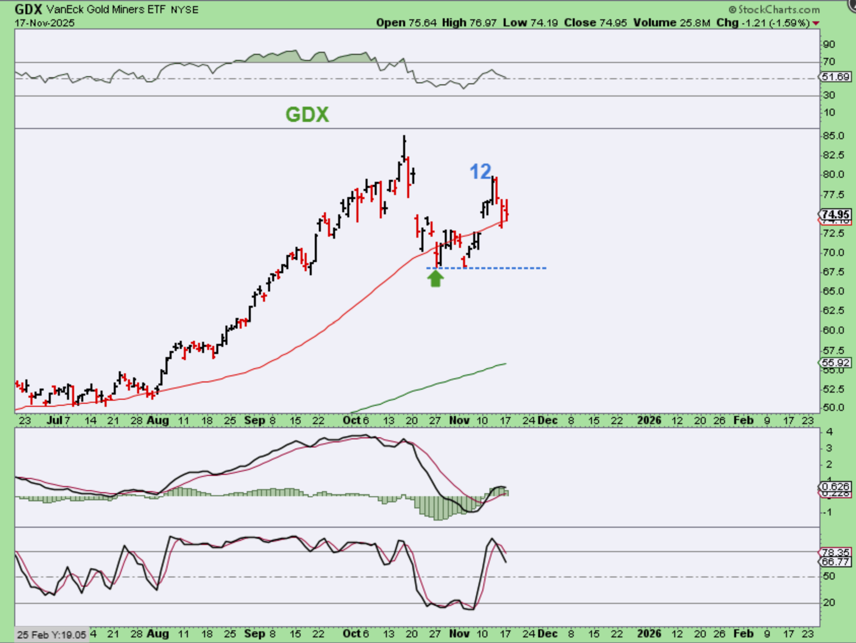 GDX basically follows Gold, but it dropped rather sharply in October, lost the 50sma for a while, and then bounced higher. It has dropped back to the 50sma and should drop lower over time, below the dcl.