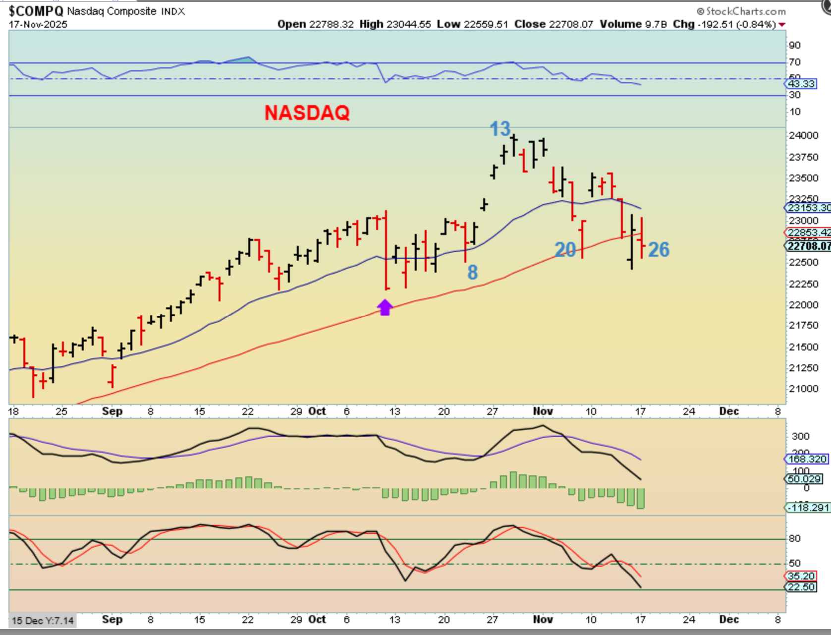 NASDAQ DAY 26 – We bounced in the morning, but sold off as the day went on. We are seeing the weakness in the markets now, as we see prices struggle to push higher, but unable to regain the former highs. We are not surprised at this weakness due to the markets ‘timing’, and we are on month 7, now expecting a drop into an ICL. THE NASDAQ LOST THE 50sma AGAIN TOO.