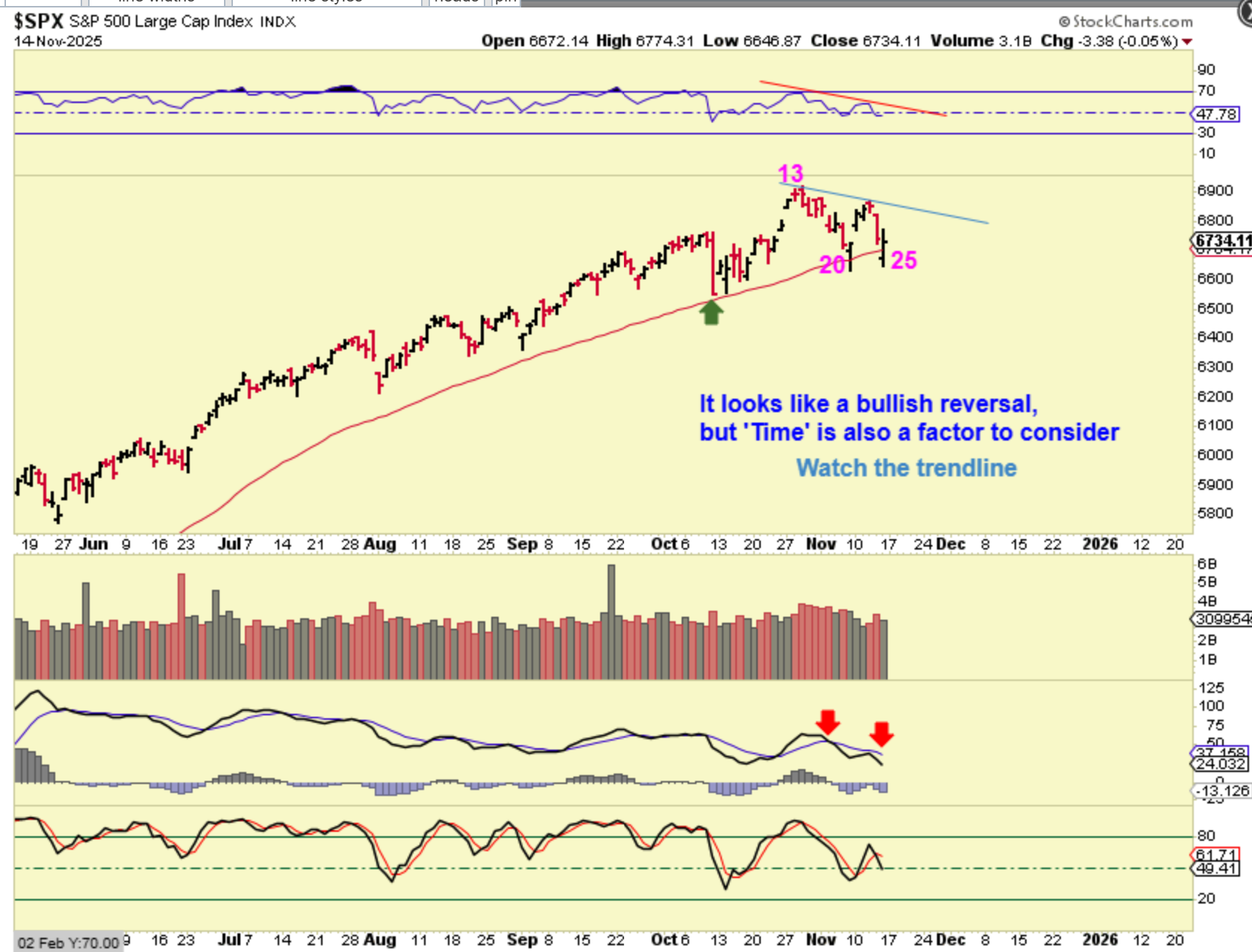 I said … “Time is a factor too. We are on the 7th month of the Intermediate cycle and we have a day 13 ‘peak’ on day 25. I think that we could bounce to the downtrend line and then roll over into an ICL drop. Look at the MACD weakness showing up too.”