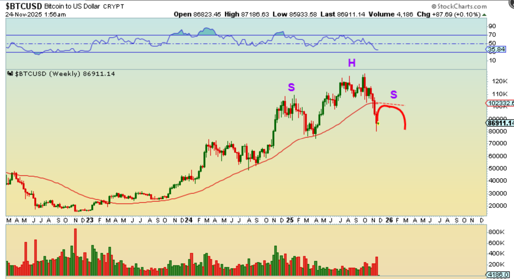 Just to show how much of a sell off it was that we just witnessed, BITCOIN pretty much gave back all of 2025’s gains since the peak in October! Wow! That may be a capitulation high volume low and a reversal that rallies higher, but again, we may get a H&S pattern and roll over after a few weeks. You could try a long trade here, and if you happen to own any crypto stocks now, you could sell the bounce to $100,000 (or more).