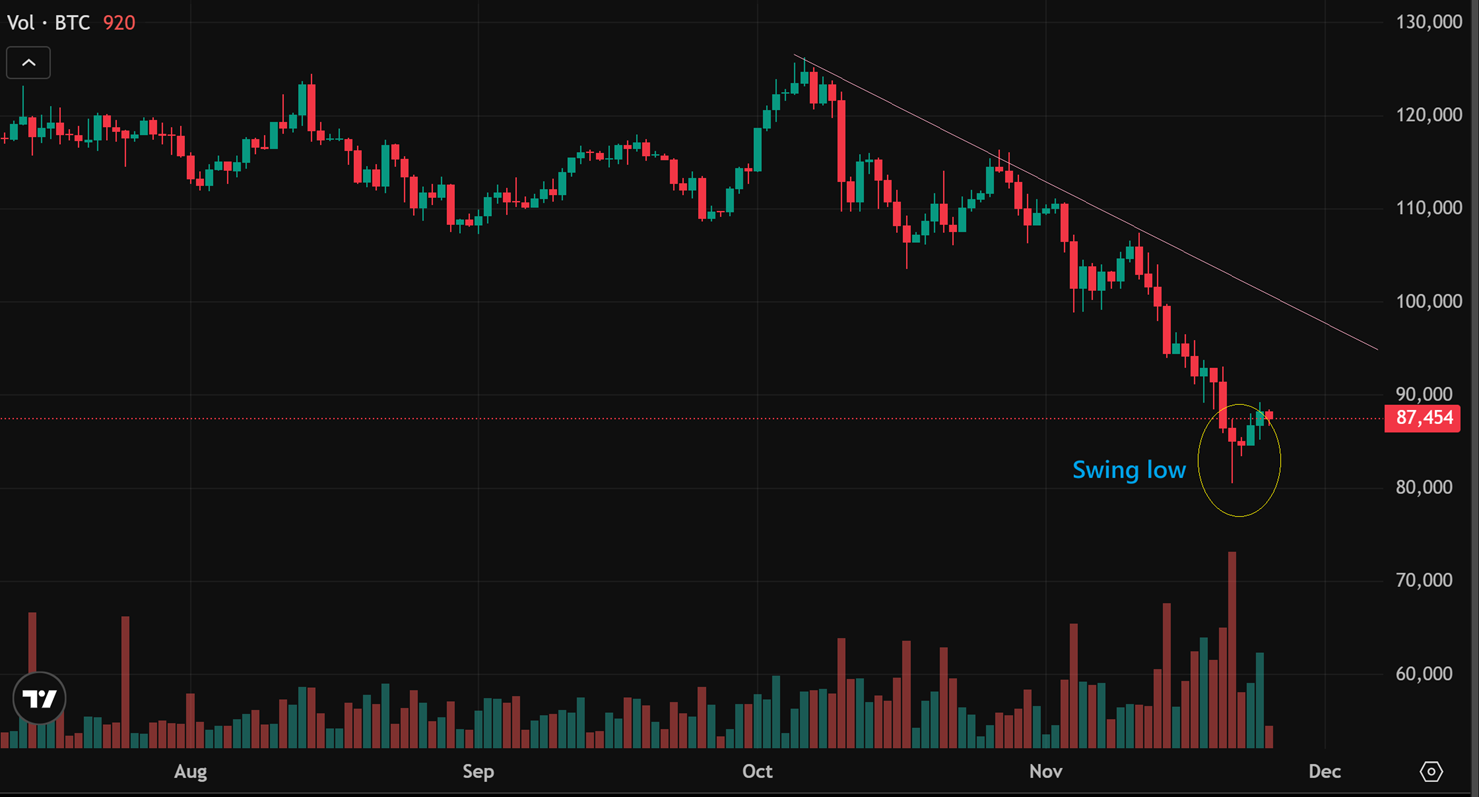We can see the a-b-c down into day 30. The stochastics is quite oversold, so a stronger bounce may occur. The RSI is quickly healing. People are talking about rate cuts in December again. So far this is a reversal, a swing low as of Monday, and price closed above the green 10sma. It does look like a dcl. I bought some stocks for trades and will sell if we drop quickly.