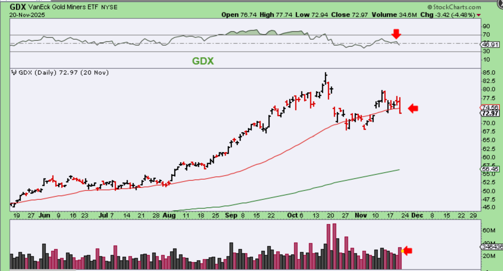 GDX -This was the GDX 2 trading days ago (last Thursday). It looked ready to plunge into a large a-b-c down. An ICL. The RSI was losing 50% and volume increased on the selling. It was rumored that a rate cut in December was off the table.
