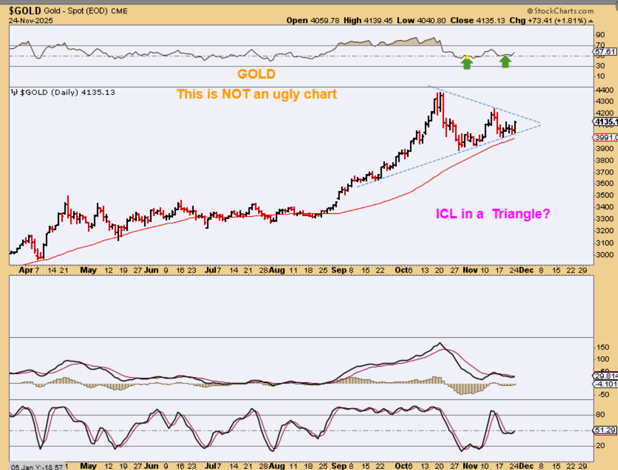 GOLD – has a day 12 peak at $4245. Day 19 popped higher. If Gold breaks above that day 12, it becomes R.T. and breaks out of that triangle. That would mean that this choppy drop lower in October and triangle formation likely formed an ICL. let’s examine Silver and the Miners.