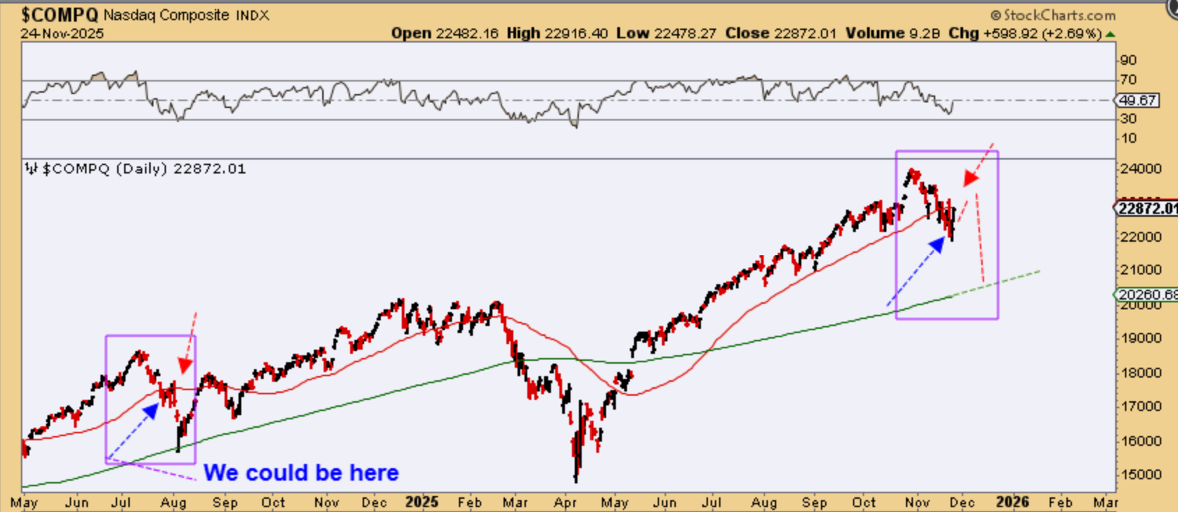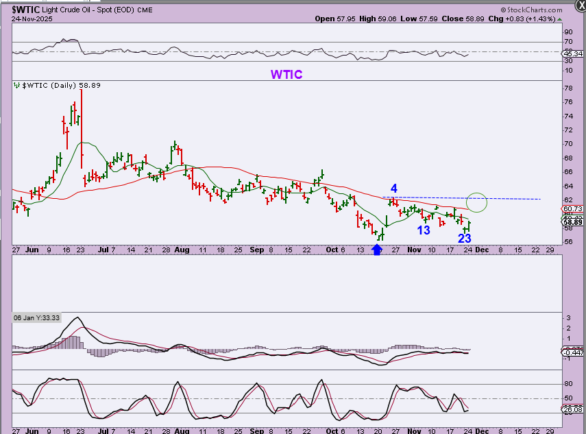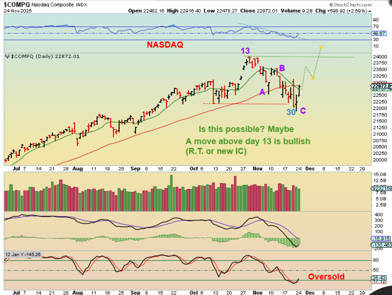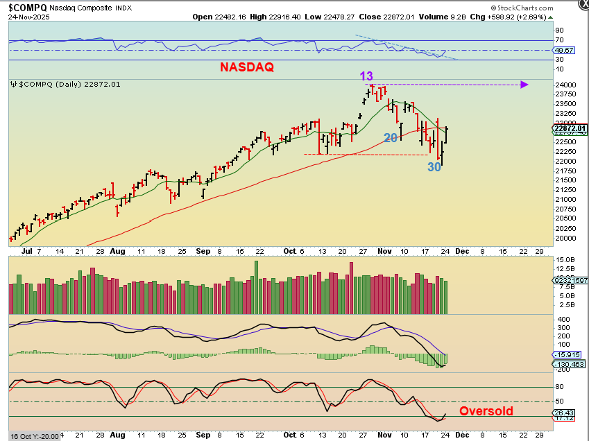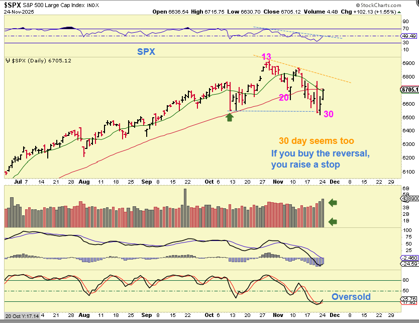 Rate cut chances in 2 weeks (Dec 10th) jumped to 85% chance in favor of a cut after several Fed remarks. Last week I was hearing that rate cuts were unlikely in December, but likely in 2026. The markets like that hope of a December rate cut, but the Fed Mtg is still 2 weeks away, so anything can happen. The markets are on day 30 and I thought that it would be perfect timing for a low on that Dec 10th Fed day, but now we have a convincing reversal. Is a day 30 low possible? It is slightly possible, but based on experience I have to view it as less likely. With our charts, I will entertain both sides of the idea in todays report.