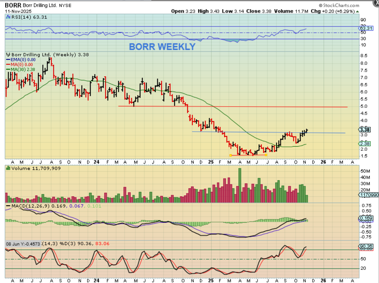 BORR WEEKLY – This is another weekly chart simply showing that these Oil stocks were beaten down and could make some gains over time if Oil rises up out of this ICL with any kind of strength. The buying volume on BORR has been growing after a capitulation type low was put into place.