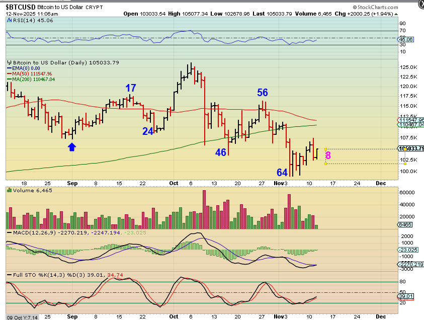 BITCOIN is on day 8 and a day 64 low is within the timing that we were targeting, so now we buy and hope for a rally. Yesterday I gave you the 2 short term possibilities with a day 8 count in place…