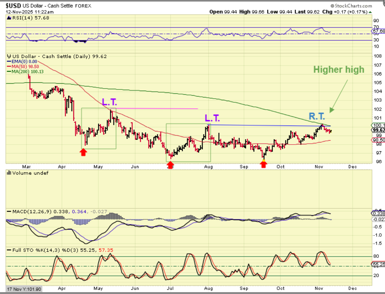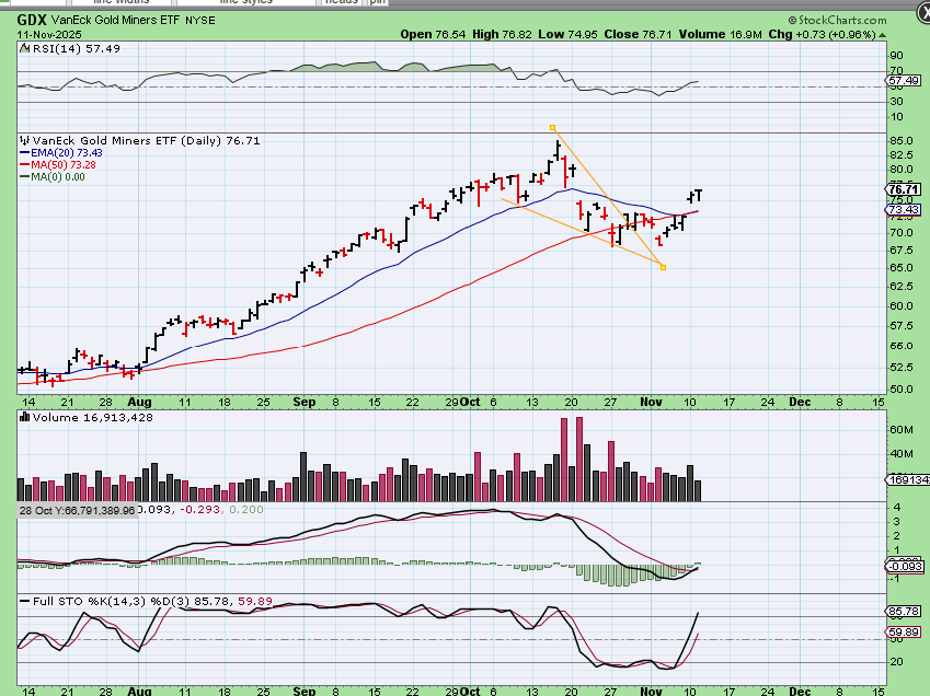 GDX is climbing higher out of the dcl too. Again, we’re looking to see if Gold or Silver can make a new high and become R.T., or will they roll over. If you bought the dcl, you just keep raising stops.