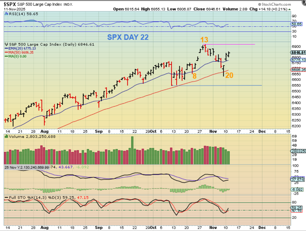 SPX – We are on day 22 and at this point the markets look normal, but you can see that we lost the 50 sma for the first time since April and the chop also grew larger. We have a day 13 peak and that makes this L.T. unless we get above that. We are on month 7 so I would have to expect this to peak with day 13 and start a pullback into an ICL, but it has been a Strong Bull Run, so we bought the dcl area with a stop under the dcl and now we raise the stop to the day 20 low. As mentioned yesterday, some stocks are healthy looking, but many lost the 50sma and look choppy.