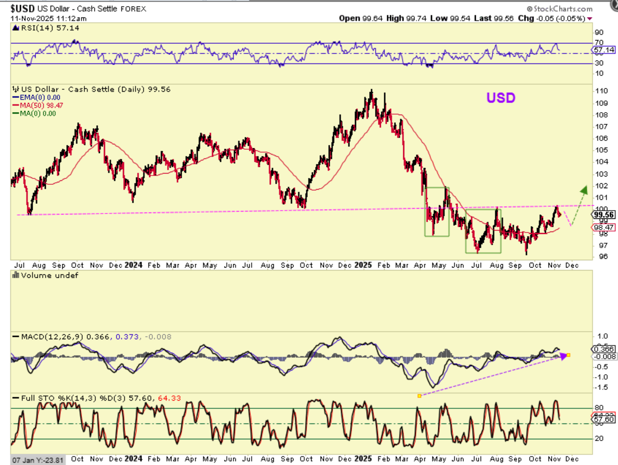 THE USD made a slightly higher highs, but found resistance at the 200sma, so it has pulled back, but I now think that it will be able to break out above that 200sma. SO FAR, this USD strength has not really hindered Gold, but the USD was rising as Gold pulled back, and now Gold has curled upward as the USD pulled back.